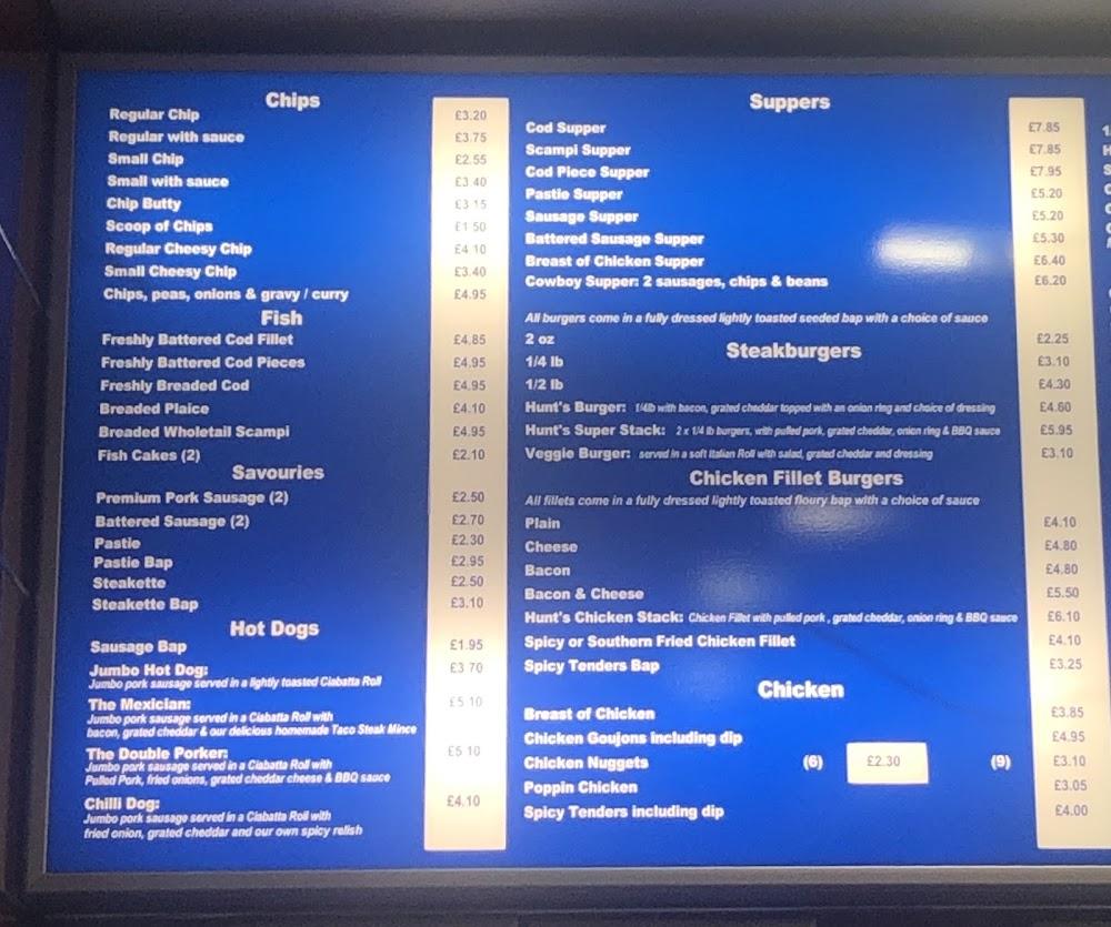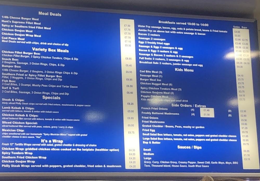 Nestled in the heart of Lambeg, Hunt's Traditional Fish and Chips stands out as a vibrant staple in the Lisburn dining scene. This takeout shop blends traditional cooking with a modern twist, making it a favored spot for locals and visitors alike. The quaint setting enhances the experience, with a casual vibe that fits perfectly into the community. Hunt's faces a busy road filled with bustling activity, making it easy to swing by for a meal after a long day or to grab something delicious before heading home.